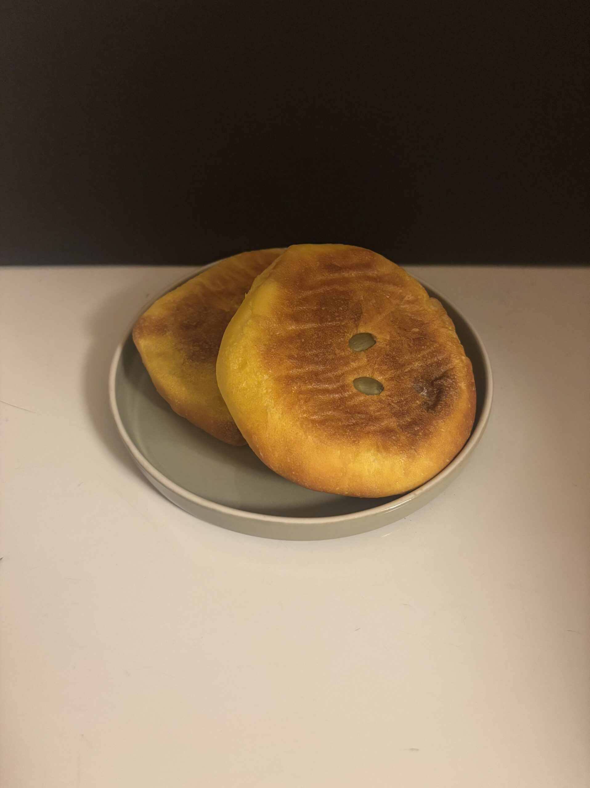 かぼちゃあんをやわらかなフランスパン生地に閉じ込め、上下から天板でプレスして香ばしく焼成しました。